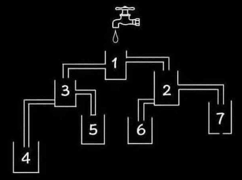 Gota numër 3 do të plotësohet së pari! Nëse ju shikoni me kujdes, uji kurrë nuk do të shkojë në gotat 4 ose 5. Megjithatë, uji nga 2 do të drejtohet në 7 ku ajo rrjedh jashtë nga fundi. Rruga midis 2 dhe 6 është gjithashtu e mbyllur! /Lajmi.net/