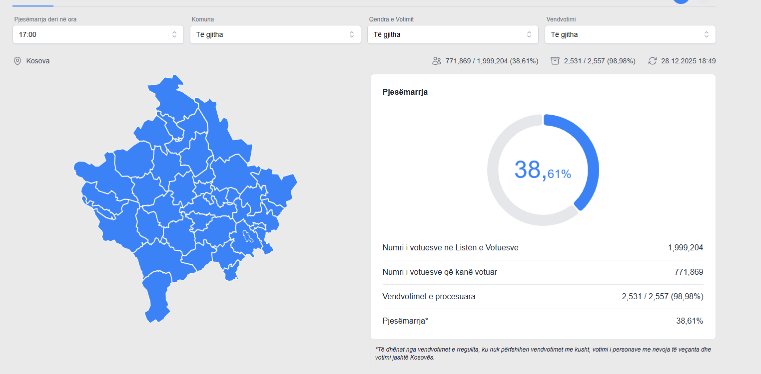 Deri në ora 18:49, për të votuar kanë dal 38,61% të qytetarëve me të drejtë vote.