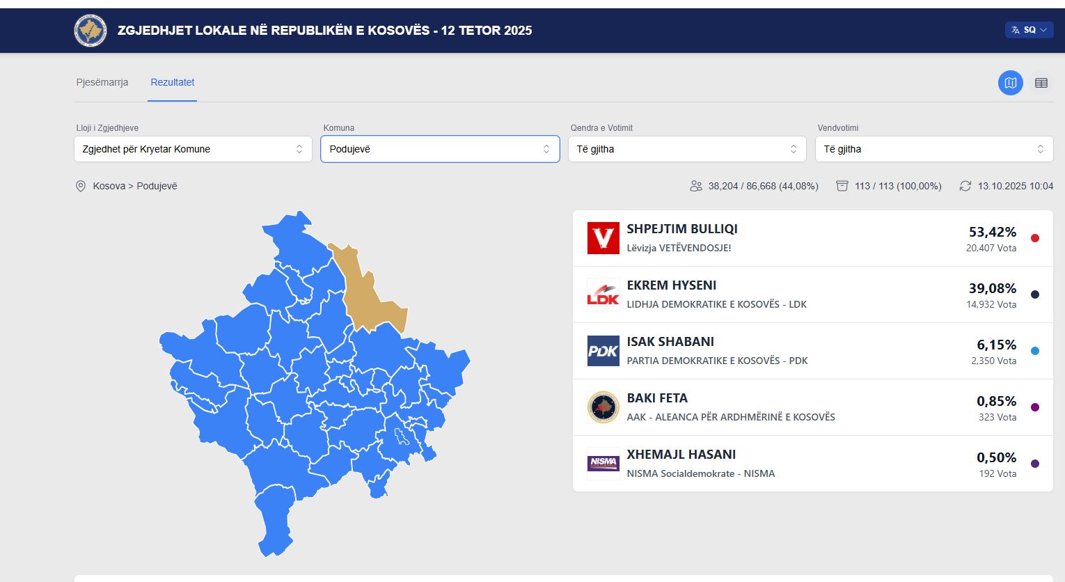 Numërimi prej 100% tanimë ka përfunduar edhe në Podujevë, komunë kjo e cila edhe për një mandat do të udhëhiqet nga Shpejtim Bulliqi i Vetëvendosjes.