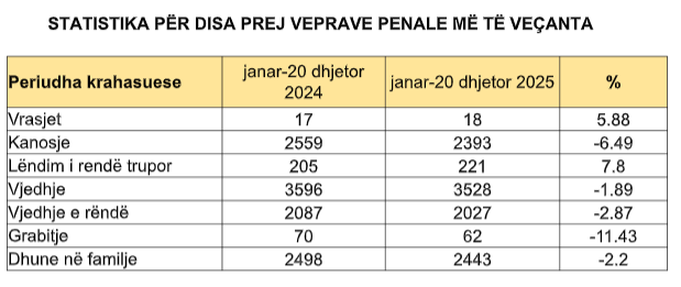 Sipas njoftimit të Policisë, gjatë periudhës janar-20 dhjetor janë iniciuar mbi 26 mijë raste për vepra penale, 3.54 për qind më pak se në periudhën e njëjtë në vitin 2024.