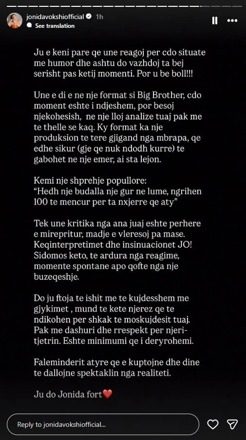 Përballë këtyre aludimeve që vazhdonin të qarkullonin, moderatorja ka reaguar sërish, kësaj here me një postim të gjatë dhe më të drejtpërdrejtë në Instagram.