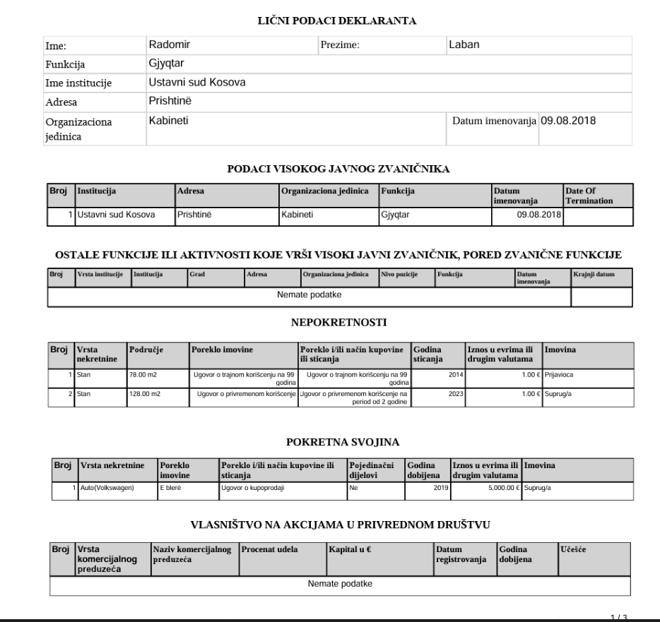 Gjyqtari i Gjykatës Kushtetuese të Kosovës, Radomir Laban, ka deklaruar pasurinë e tij, ku përveç kursimeve të konsiderueshme në banka, bie në sy edhe vlerësimi simbolik i pasurive të paluajtshme.