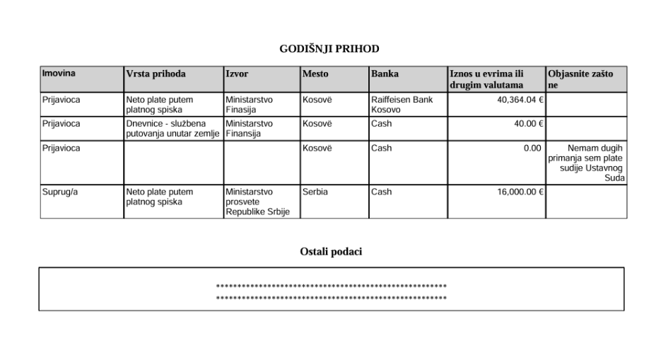Ai ka deklaruar gjithashtu edhe 40 mijë e 364 euro pagë vjetore, ndërsa për bashkëshorten e tij ka deklaruar se punon në Ministri të Arsimit të Serbisë dhe merr pagë vjetore 16 mijë euro.