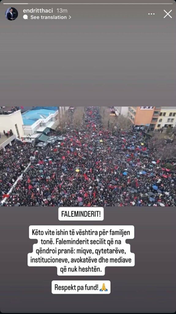 “FALEMINDERIT! Këto vite ishin të vështira për familjen tonë. Faleminderit secilit që na qëndroi pranë: miqve, qytetarëve, institucioneve, avokatëve dhe mediave që nuk heshtën. Respekt pa fund!”, ka shkruar Endrit Thaçi.