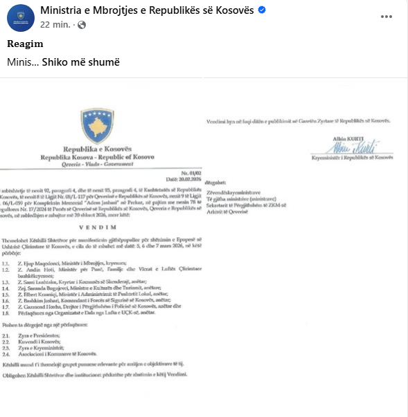 Ministria e Mbrojtjes ka reaguar ndaj pretendimeve se përfaqësuesit e organizatave të dala nga lufta e Ushtrisë Çlirimtare të Kosovës (UÇK) nuk janë përfshirë në Këshillin Organizativ për shënimin e 28-vjetorit të Epopesë së UÇK-së, duke i cilësuar këto pretendime si të pasakta dhe të pabazuara. Sipas vendimit Nr. 01/02 të Qeverisë së Republikës së…
