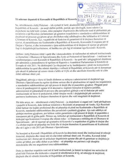 Është dorëzuar në Parlament, Peticioni i nënshkruar nga 336 intelektualë të Kosovës, përfshirë ish-gjyqtarë, akademikë, profesorë dhe juristë, me të cilin i kërkohet Kuvendit të Kosovës miratimi i një Rezolute që garanton standarde të drejta, të paanshme dhe transparente në proceset gjyqësore që po zhvillohen në Dhomat e Specializuara të Kosovës ndaj ish-krerëve të UÇK-së, Hashim Thaçit, Kadri Veselit, Jakup Krasniqit e Rexhep Selimit.