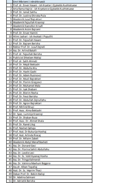 Nisma u ndërmor nga ish-kryetari i Gjykatës Kushtetuese, Enver Hasani, ish-avokati i popullit, Ilmi Jashari, ish-kryetarja e Gjykatës Kushtetuese, Arta Rama, dhe të tjerë.