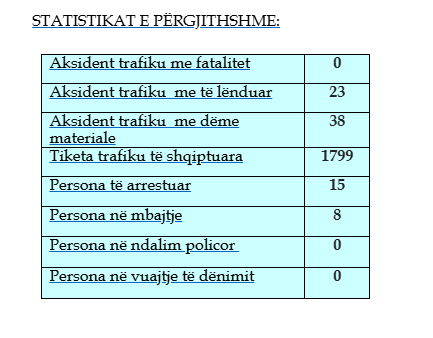 Sipas raportit, në këtë periudhë nuk është shënuar asnjë aksident trafiku me fatalitet, ndërsa janë regjistruar 23 aksidente me të lënduar dhe 38 të tjera me dëme materiale.