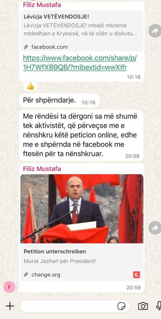 Gazeta Nacionale ka siguruar një bisedë në rrjetin social WhatsApp ku një zyrtar i lartë i VV-së, tenton ta shpërndajë këtë peticion.