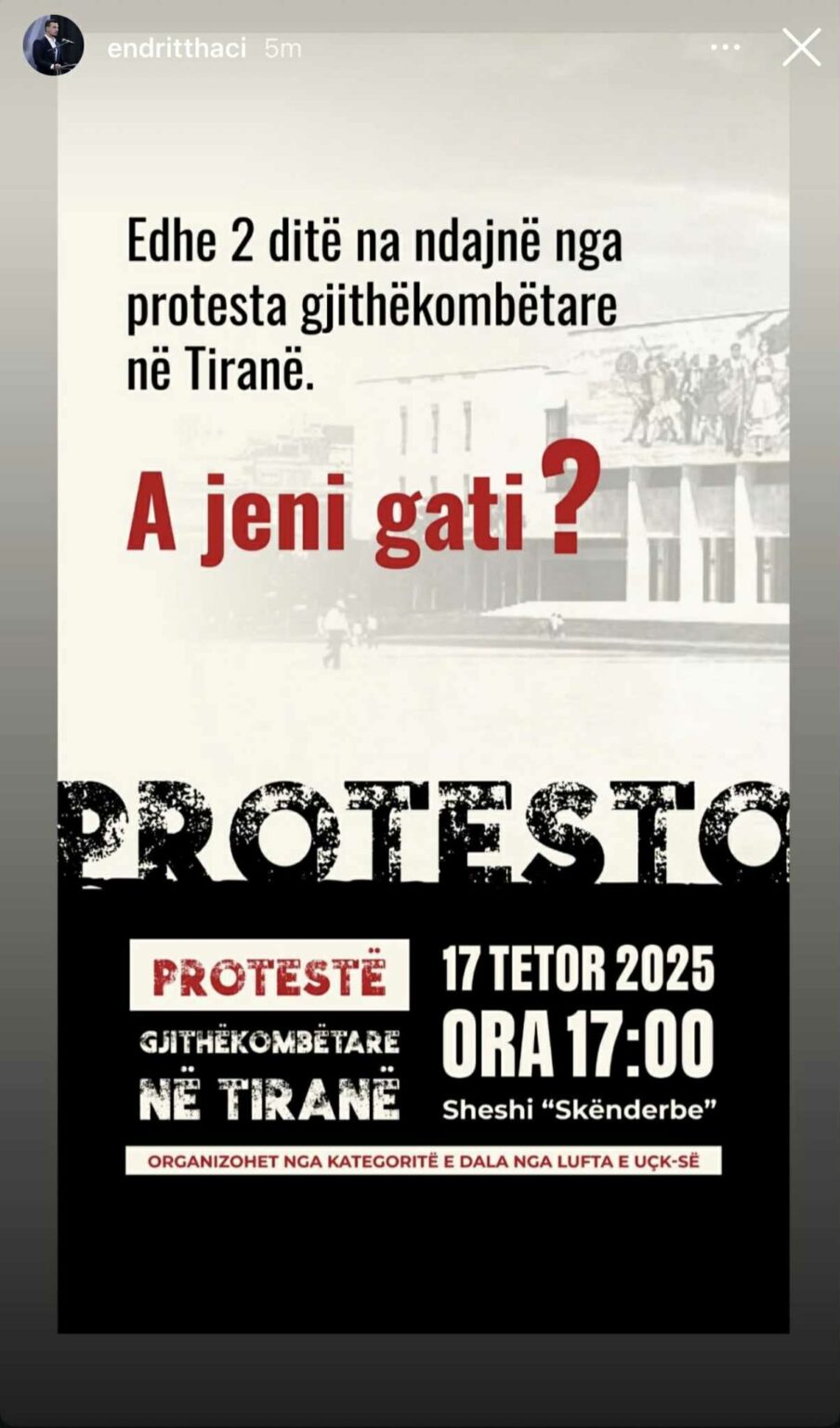 Djali i ish-presidentit Hashim Thaçi, Endriti ka rishpërndarë thirrjen për protestën gjithëkombëtare e cila do të mbahet të premten në Tiranë. Ai ndau thirrjen në llogarinë e tij në Instagram, mbi të cilën shkruan: “A jeni gati?”. Në këtë protestë e cila organizohet nga kategoritë e dala nga lufta e UÇK-së dhe e cila ka…
