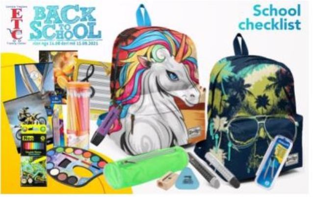 Ejani në ETC dhe bëni blerjet e juaja, zgjedhje të shumta në mbi 2500 artikuj të nevojshëm shkollor për të gjitha nivelet me Ofertën më të mirë.