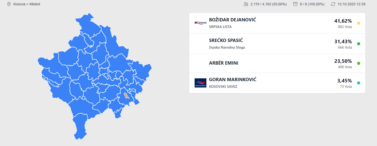 Bozidar Dejanoviç ka mbledhur 41,62% të votave duke dal i pari për të shkuar në balotazh me Srecko Spasiç nga Srpska Narodna Sloga i cili ka mbledhur 31,43% të votave. Arbër Emini ka mbledhur 23,50 të votave ndërsa Goran Marinkoviç nga Kosovski Savez ka marrë 3,45%.