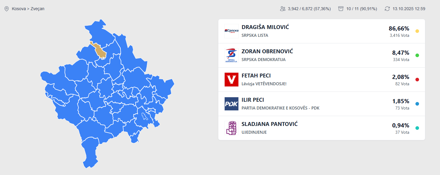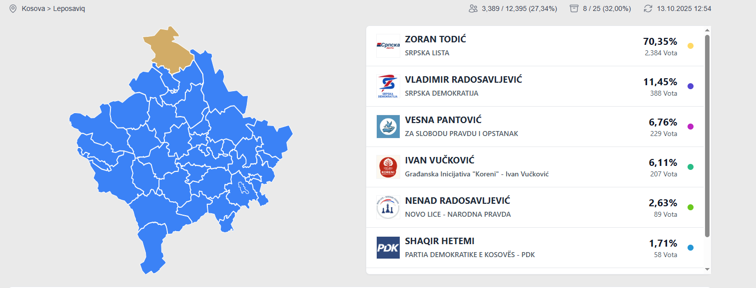 Kandidati i Listës Serbe për kryetar të Leposaviqit, Zoran Todiç ka fituar këtë garë me 70,35% të votave, apo 2 mijë e 384 vota.
