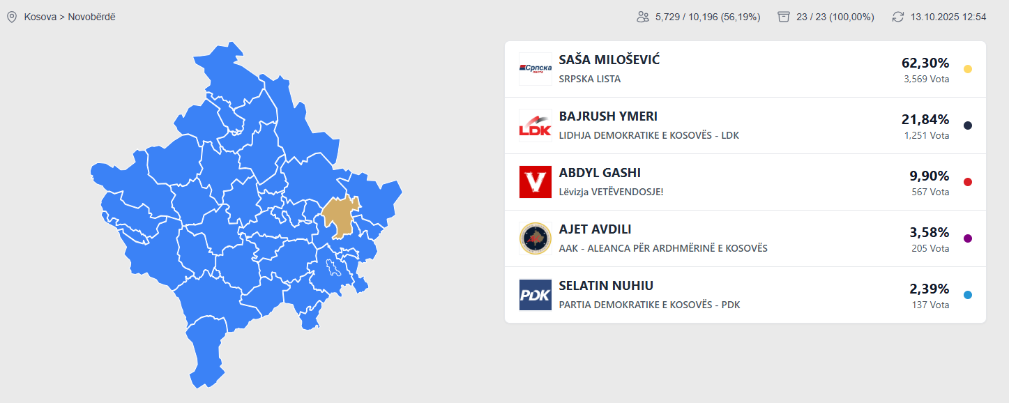 Sikurse në Leposaviq, edhe në Novobërdë ka fituar kandidati i Listës Serbe, Sasa Miloseviç me 62,3% të votave apo 3 mijë e 569 sosh. Ai ka lënë pas vetes Bajrush Ymerin e LDK-së me 21,84$, Abdyl Gashin e VV-së me 9,9%, Ajet Avdilin e AAK-së me 3,58% dhe Selatin Nuhiun e PDK-së me 2,39%.