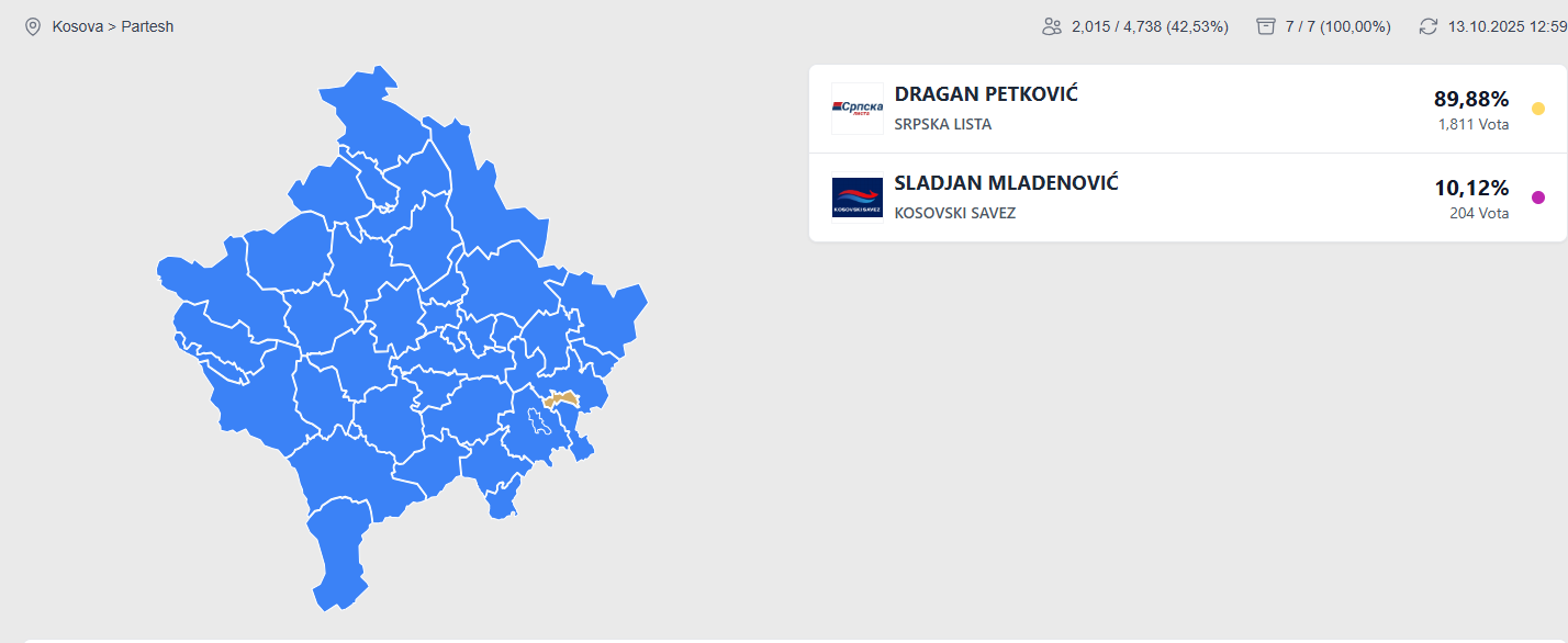 Edhe Parteshi u fitua bindshëm nga kandidati i Listës Serbe, Dragan Petkoviç i cili mori 89,88% të votave ndërsa i dyti doli Sladjan Mladenoviç me 10,12%.