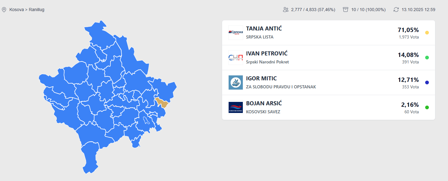 Në katër vitet e ardhshme, edhe Ranilluga do të udhëhiqet nga kandidati i Listës Serbe, Tanja Antiç i cili ka fituar me 71,05%. Kandidati i dytë në bazë të rezultatit në këto zgjedhje është Ivan Petroviç nga Srpski Narodni Pokret me 14,08%, pastaj Igor Mitiç nga Za Slobodu Pravdu i Opstanak më 12,71% dhe Bojan Arsiç nga Kosovski Savez me 2,16%.