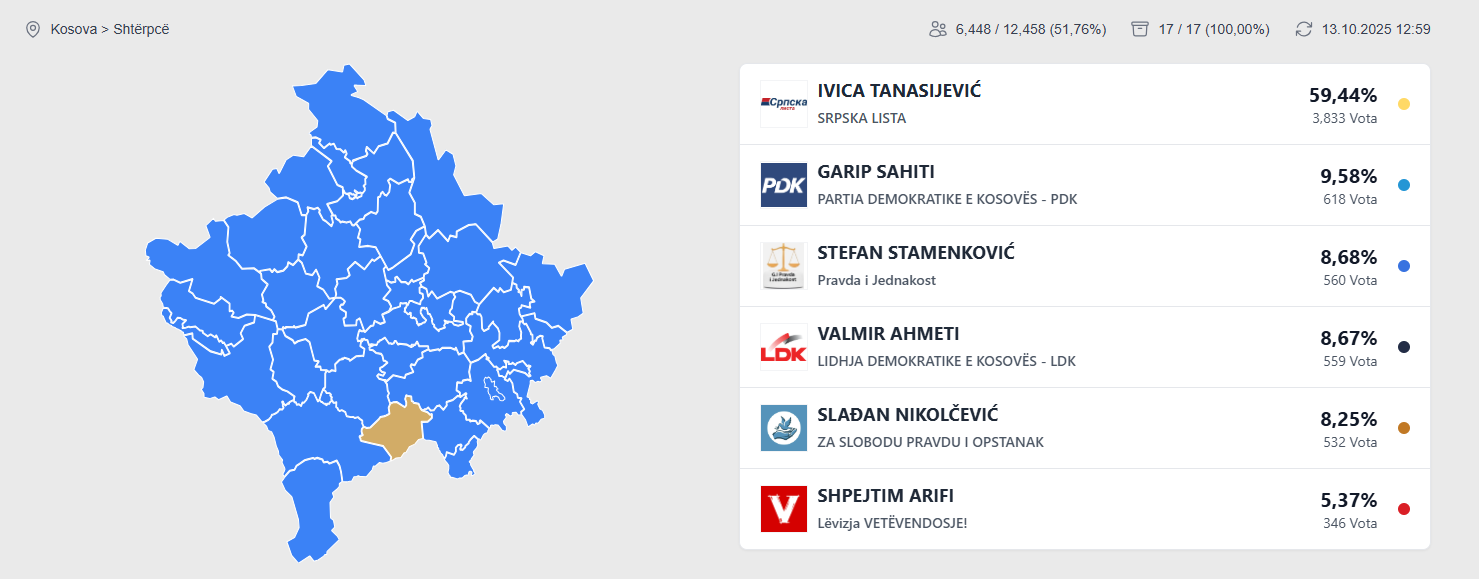 E njëjta ka ndodhur edhe në Komunën e Shtërpcës, ku ka fituar pa balotazh kandidati i Listës Serbe, Ivica Tanasijeviç me 59,44%. Ai ka lënë pas Garip Sahitin e PDK-së me 9,58%, Stefan Stamenkoviç nga Pravda i Jednakost me 8,68%, Valmir Ahmetin e LDK-së me 8,67%, Slabadan Nikolceviç me 8,25% dhe Shpejtim Arifin e VV-së me 5,37%.