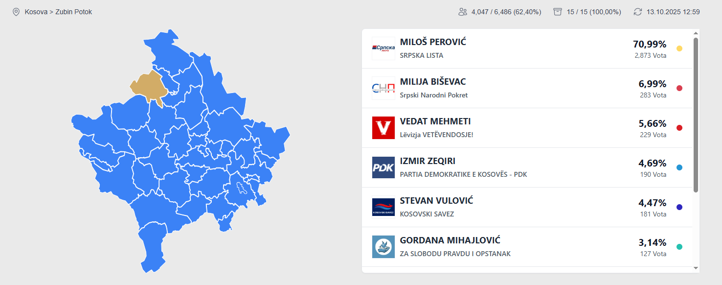 Lista Serbe ka fituar edhe në Zubin Potok, me kandidatin Milos Peroviç i cili ka mbledhur 70,99%. Pas tij është Milija Bisevaç nga Srpski Narodni Pokret me 6,99%, Vedat Mehmeti i VV-së me 5,66%, Izmir Zeqiri i PDK-së me 4,69%, Stefan Vuloviç nga Kosovski Savez me 4,47% dhe Gordana Mihajloviç me 3,14 %.