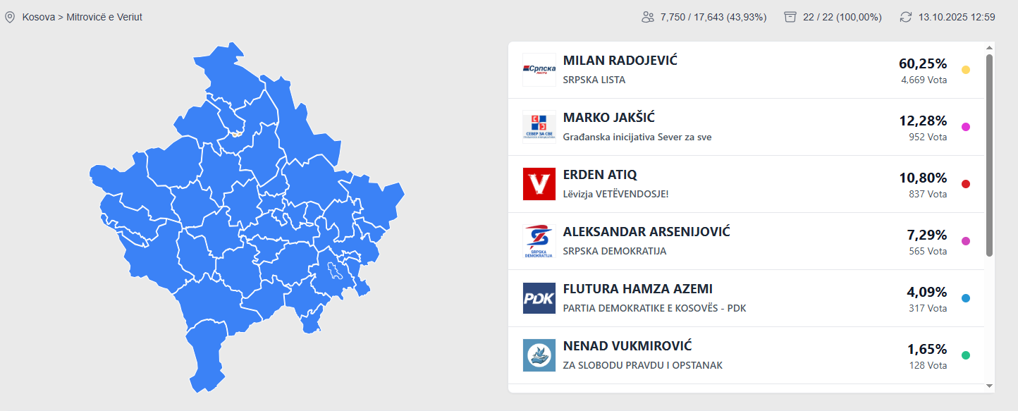 Nëntë nga dhjetë komunat me shumicë serbe, i ka fituar Lista Serbe pa balotazh me përqindje shumë të lartë të të votave. Vetëm në Komunën e Kllokotit do të ketë balotazh mes dy kandidatëve serb.