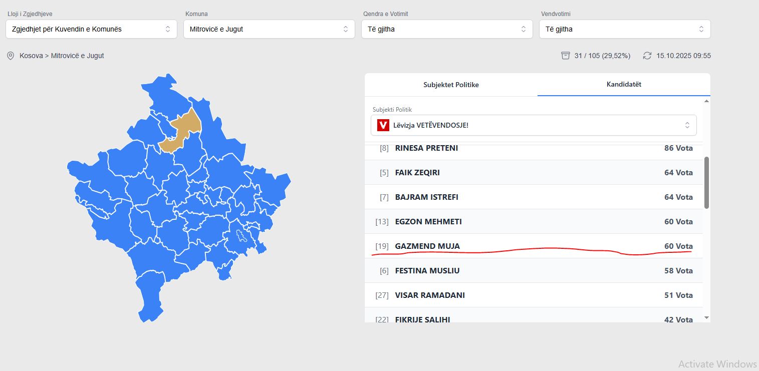 Janë numëruar 29.52 për qind të vendvotimeve për kandidatët për asamble në komunën e Mitrovicës së Jugut. Vëllai i deputetit Armend Muja, Gazmend Muja gjendet në listën e LVV-së për asamble me numrin 19, transmeton lajmi.net. Nga afro 30 për qind të votave të numëruara, Muja është duke performuar dobët momentalisht. Ai ka veç 60…
