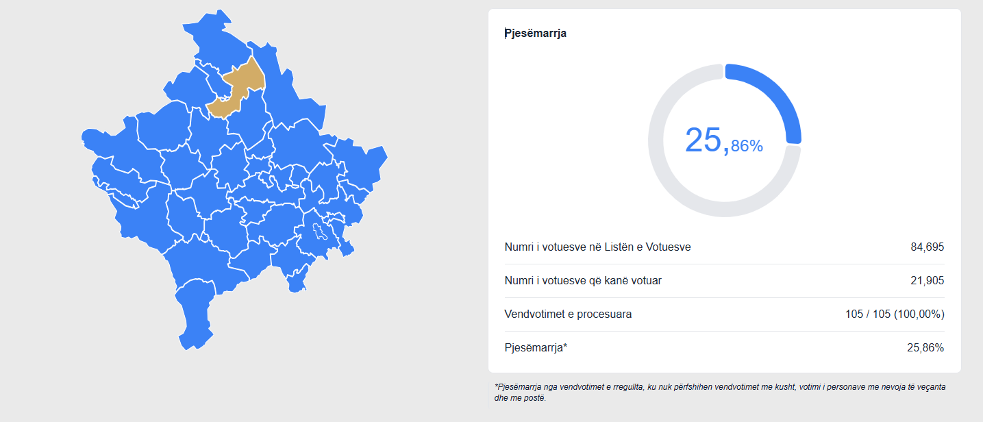 Bazuar në të dhënat e publikuara nga KQZ, deri në orën 15:00 nga 84 mijë e 695 votues në lista të votimit, vetëm 21 mijë e 905 qytetarë kanë votuar.