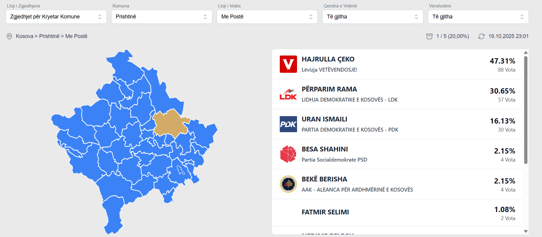 Nga 20 për qind e votave të numëruara, prin kandidati i Vetëvendosjes Hajrulla Çeku me 47.31 për qind ose 88 vota.