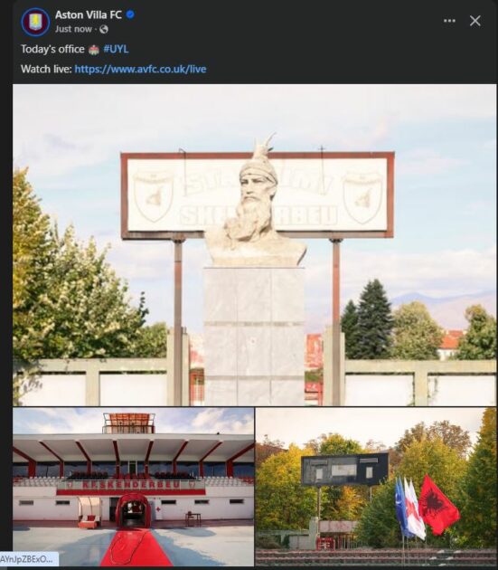 Skuadra e njohur angleze, Aston Villa sapo ka vendosur në Facebookun fotografinë e bustit të Skëndërbeut. Ky postim lidhet me ndeshjen e grupmoshave U19 që skuadra angleze luan sot në Korçë ndaj Skënderbeu. Ndeshja luhet në orën 15:00.
