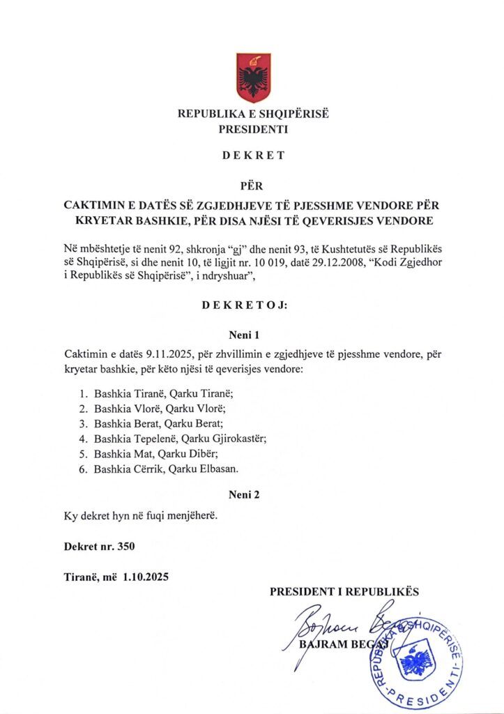 Presidenti i Shqipërisë, Bajram Begaj ka vendosur të dekretojë këtë të mërkurë datën 9 nëntor 2025 për mbajtjen e zgjedhjeve të parakohshme vendore në Tiranë, si dhe në pesë komuna të tjera, Vlorë, Berat, Mat, Tepelenë dhe Cërrik.