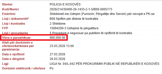 Dokumentet bëjnë të ditur se kjo lloj procedurë është aplikuar për një kontratë me vlerë të konsiderueshme financiare, që lidhet me furnizimin, përgatitjen dhe servimin e ushqimit për nevojat e Policisë së Kosovës.