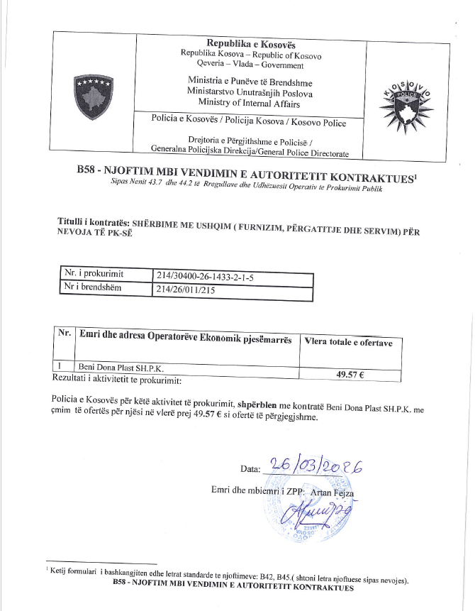Kontrata njihet si (Shërbimet me ushqim, furnizim, përgatitje dhe servim) për nevojat e Policisë së Kosovës.