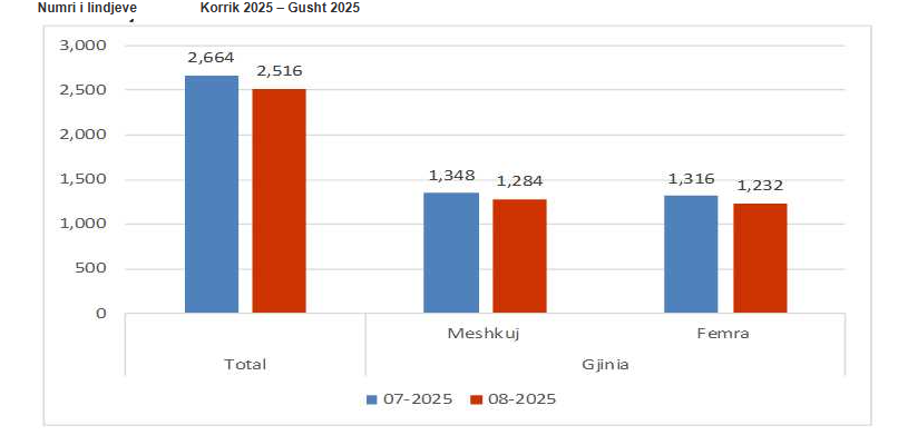 Në muajin gusht të këtij viti janë regjistruar 2 mijë e 516 lindje (brenda dhe jashtë Kosovës). Prej këtyre lindjeve të regjistruara, 1 mijë e 284 lindje janë meshkuj dhe 1 mijë e 232 lindje janë femra.