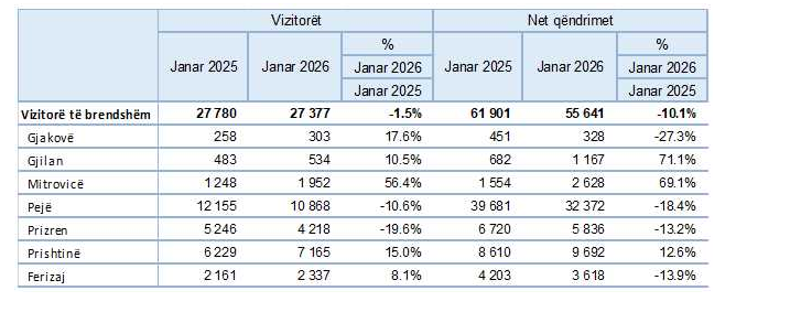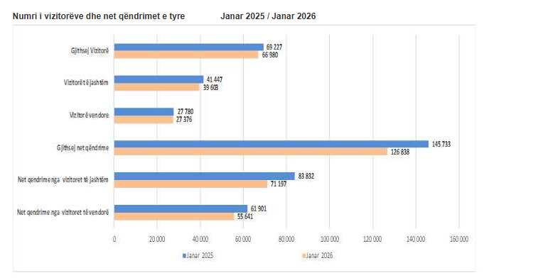 Sa u përket vizitorëve të huaj, krahasuar me periudhën paraprake (Janar 2025) pati një rënie të vizitorëve për 4,4 %.