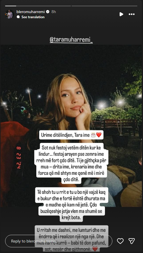 “Urime ditëlindjen, Tara ime! Sot nuk festoj vetëm ditën kur ke lindur… festoj arsyen pse zemra ime rreh më fort çdo ditë. Ti je gjithçka për mua – drita ime, krenaria ime dhe forca që më shtyn me qenë më i mirë çdo ditë”, ka shkruar ai.