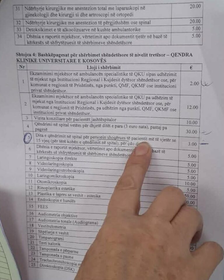 Familjarët që qëndrojnë pranë pacientëve të shtrirë në klinikat e QKUK-së duhet të paguajnë 3 euro për çdo 24-orë qëndrimi. Kjo tarifë aplikohet për përcjellësit e pacientëve që marrin trajtim spitalor, pa përjashtim, përfshirë edhe pensionistët. Pagesa bëhet edhe në rastet kur prania e familjarit është e domosdoshme për përkujdesje ndaj pacientit, sidomos për të…