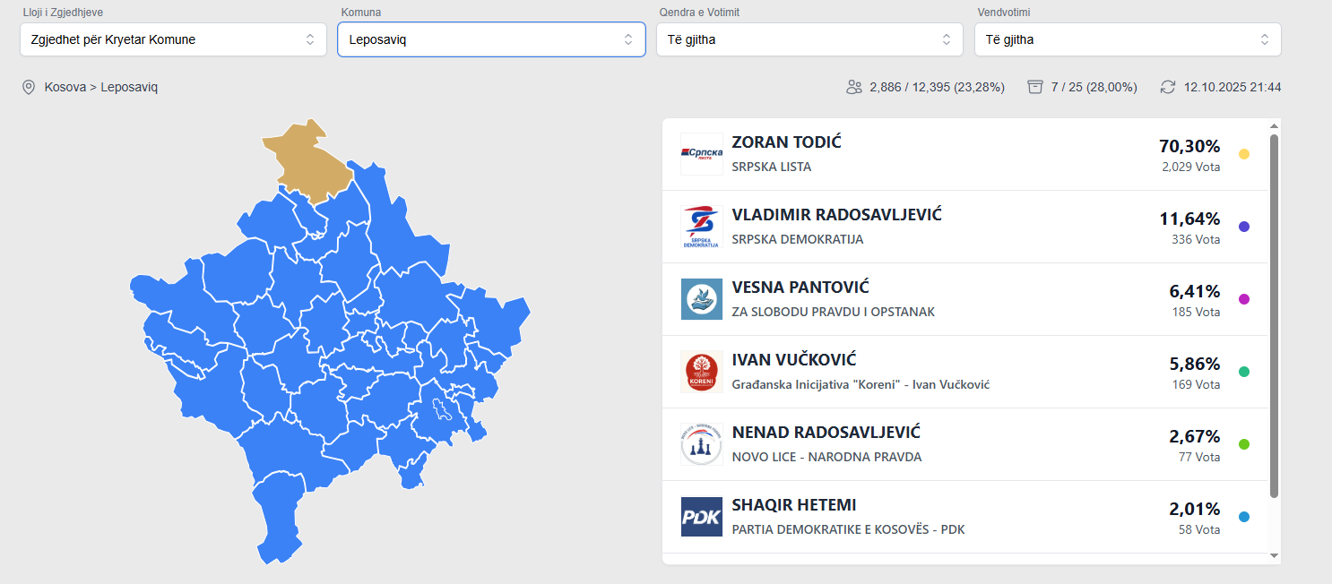 Në Leposaviq, Zoran Todiç nga Lista Serbe nga 23.28 të votave të numëruara ka marrë 70.3% të votave.