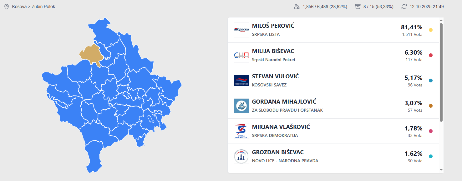 Në Zubin Potok, nga 26.62% i votave të numëruara dhe 53.33% të vendvotimeve të numëruara, Milos Perovic nga Lista Serbe ka marrë 81.41%.