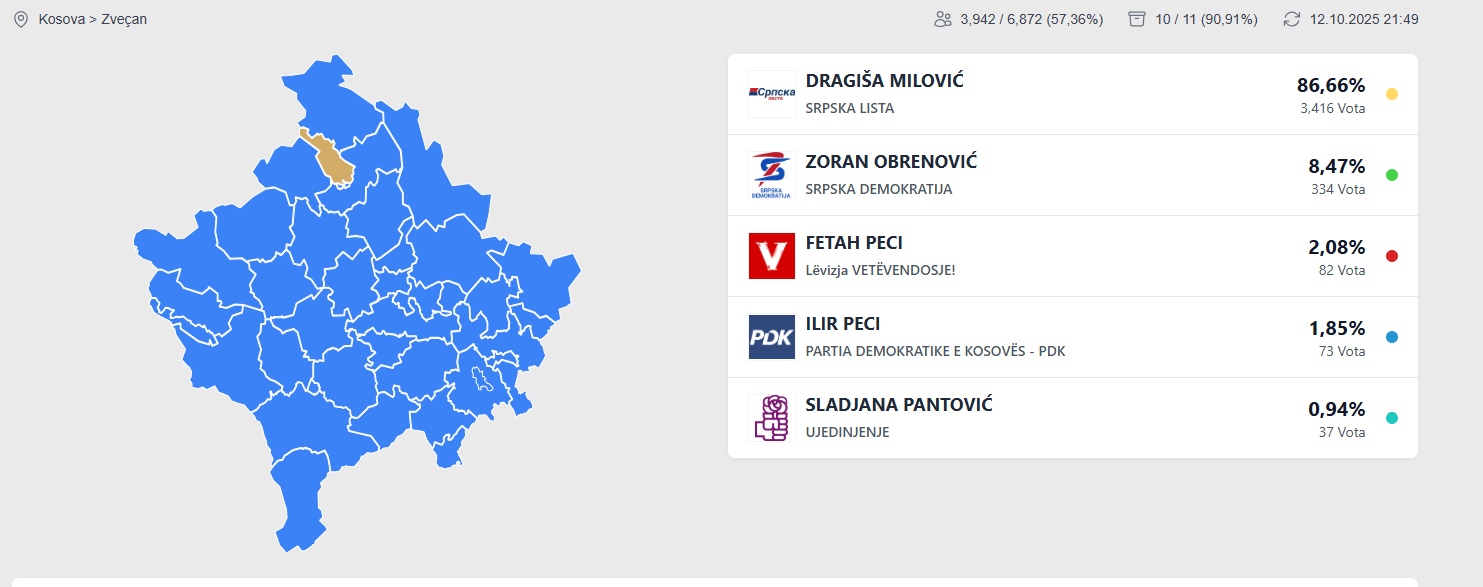 Edhe në Zveçan, nga numërimi i 57.36% të votave apo 90.91% të vendvotimeve, kandidati i Listës Serbe, Dragisa Miloviç ka dal i pari me 86.66%.