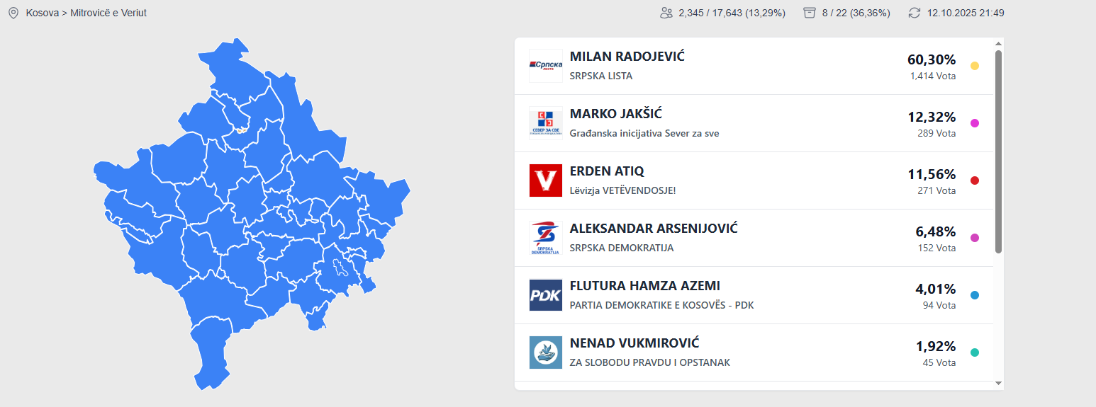 Në Mitrovicë të Veriut, nga 13.29% të votave të numëruara apo 36.36% të vendvotimeve, ka fituar Milan Radojeviç nga Lista Serbe.