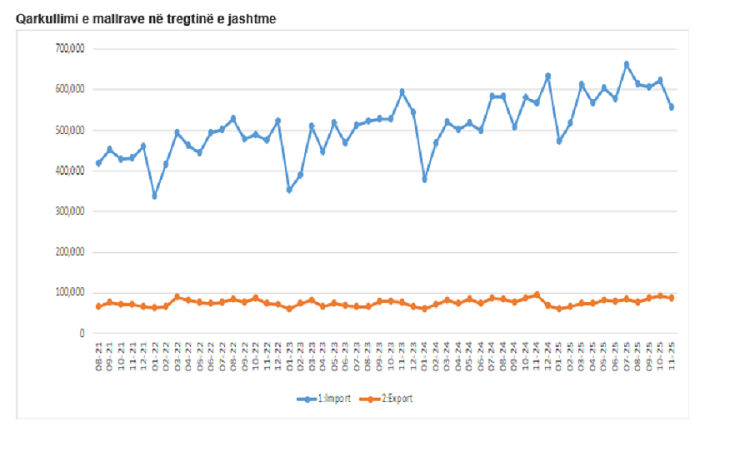 Sipas ASK-së, eksporti i mallrave në muajin nëntor 2025 kishte vlerën 87,7 milionë euro, ndërsa importi 557,6 milionë euro, që është një rënie prej 9,5 për qind për eksport, si dhe një rënie prej 1,6 për qind për import, duke krahasuar me periudhën e njëjtë të vitit 2024.