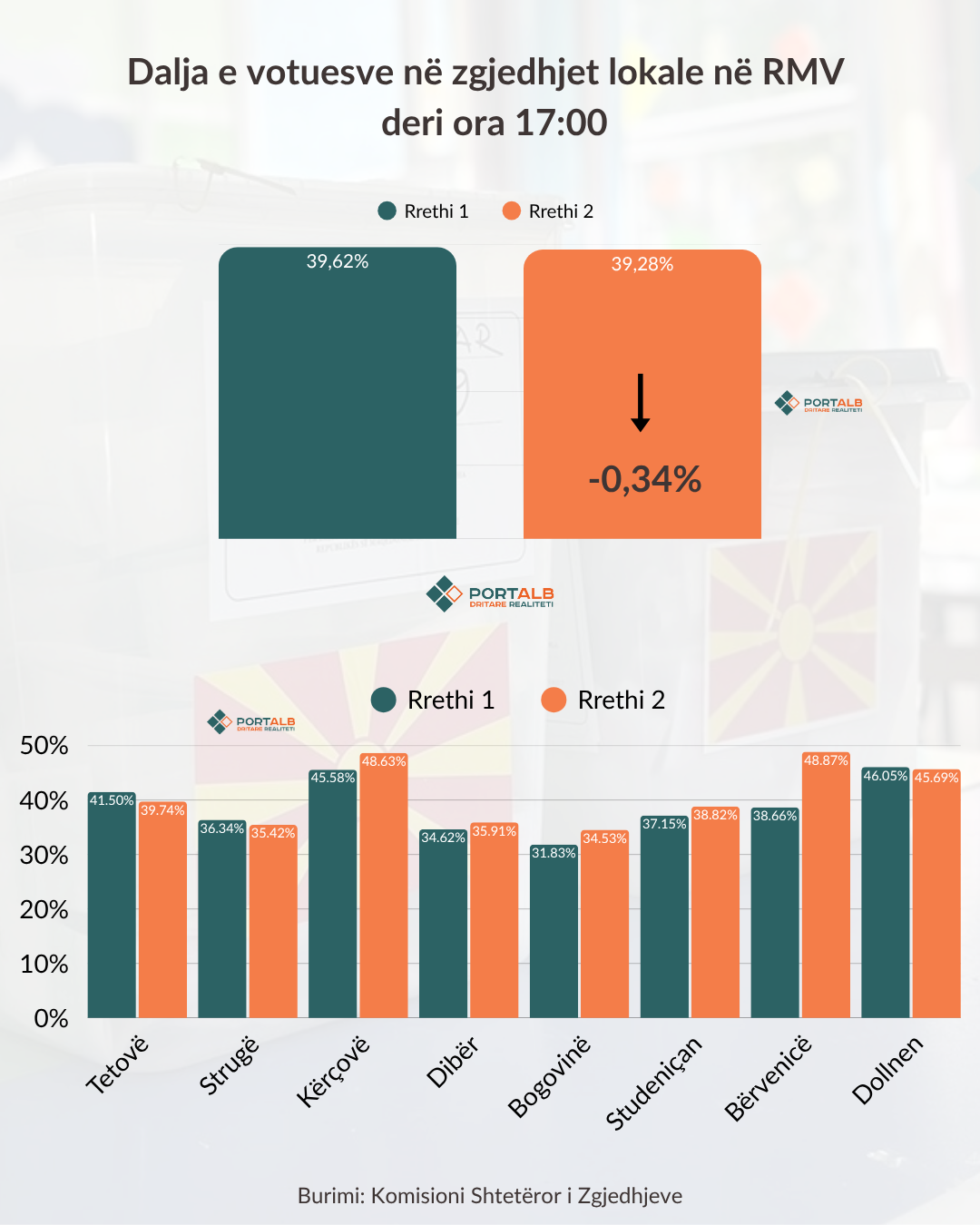 Deri në ora 17:00 në raundin e dytë të zgjedhjeve lokale më 9 nëntor dolën për të votuar 39.28 % e votuesve të regjistuar në Maqedoni të Veriut. Sipas Portalb.mk, për krahasim, në raundin e parë të zgjedhjeve lokale, deri në këtë orë kanë votuar 727.488 qytetarë, gjegjësisht 39.86%. Më poshtë mund të shihni infografikun…