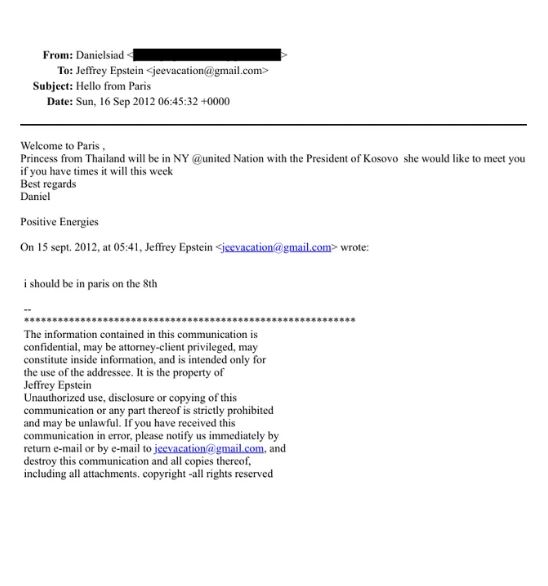 Sipas një emaili të bërë publik, dërguar nga një person i identifikuar vetëm me emrin “Daniel”, përmendet një mundësi takimi në Nju Jork. Në mesazh thuhet se “Princesha nga Tajlanda do të jetë në New York, në Kombet e Bashkuara, me presidenten e Kosovës” dhe se ajo do të ishte e interesuar për një takim, nëse do të kishte kohë gjatë asaj jave, raporton telegrafi, transmeton lajmi.net.