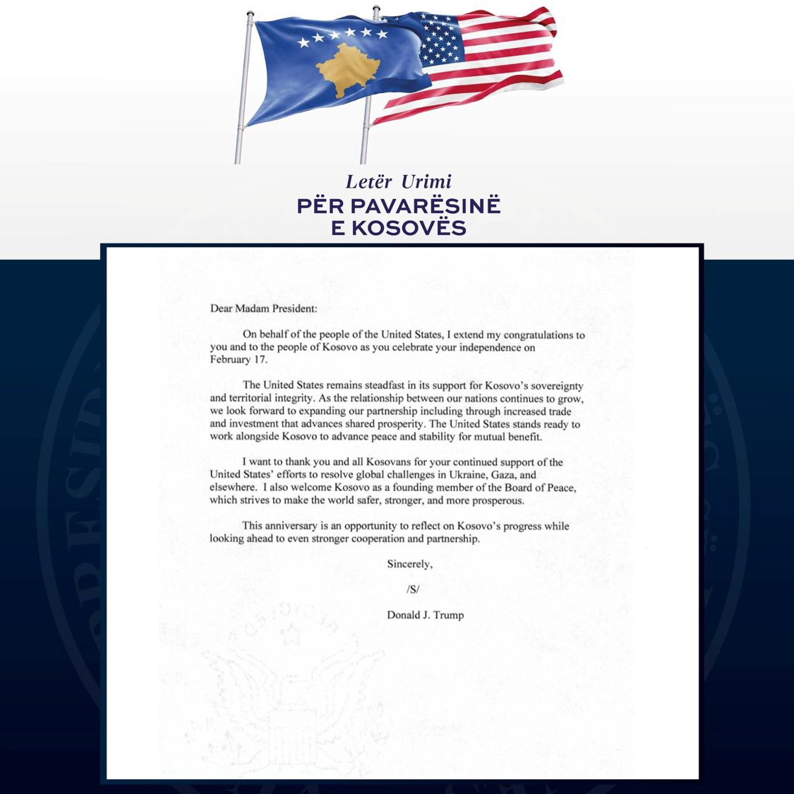 Në letrën e tij Trump ka përgëzuar popullin e Kosovës për këtë përvjetor të rëndësishëm, duke rikonfirmuar mbështetjen e palëkundur të Shteteve të Bashkuara të Amerikës për sovranitetin dhe integritetin territorial të Republikës së Kosovës.