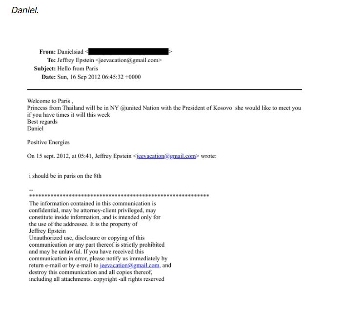 Në mesazhet e publikuara nga Departamenti Amerikan i Drejtësisë, dosja Jeffrey Epstein, përmendet edhe ish-presidentja e Kosovës, Atifete Jahjaga, e cila mbante këtë pozicion në vitin 2012. Në një email të dërguar nga një person me emrin “Daniel”, identiteti i të cilit mbetet i panjohur, thuhet: Mirë se vini në Paris, Princesha nga Tajlanda do…