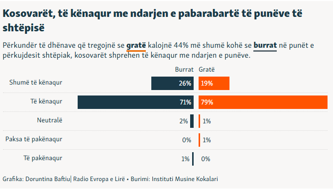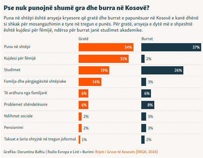 Një raport i vitit 2024 i Rrjetit të Grave të Kosovës tregonte se si burrat, edhe gratë ndihen të mbingarkuara nga puna në shtëpi – gjë që i shtyn të mos jenë aktivë në tregun e punës.