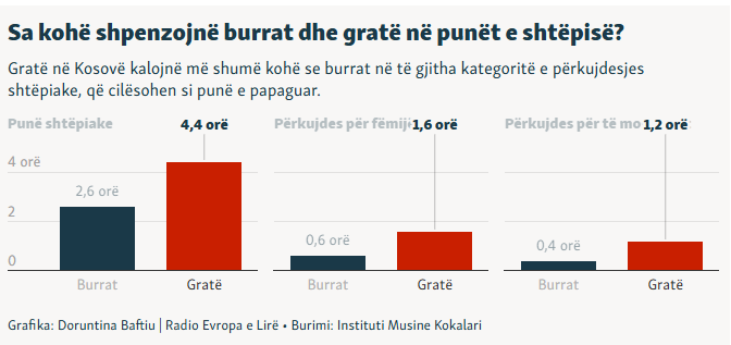 Sipas këtij raporti, një grua në Kosovë shpenzon mesatarisht 6 orë e 20 minuta në ditë – pak më pak se një orar i plotë pune – duke kryer punët e shtëpisë dhe duke u përkujdesur për familjarë.