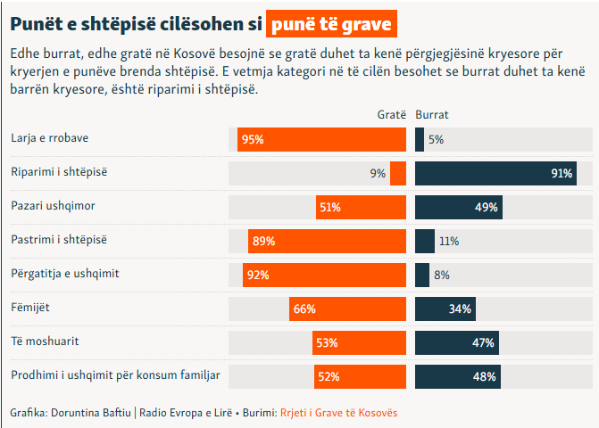 Këtë barrë të kujdesit dhe punëve të shtëpisë e bartin dukshëm më shumë gratë sesa burrat kudo në Kosovë.