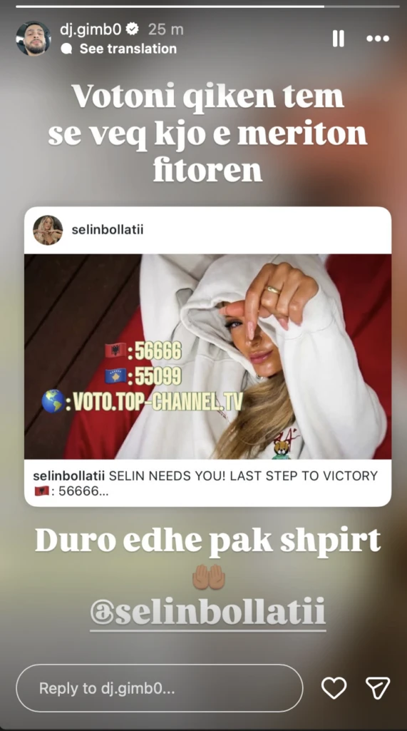 Së fundmi, vëmendje ka tërhequr DJ Gimbo, i cili ka shprehur publikisht përkrahjen për partneren e tij, Selin, një nga emrat më të komentuar të këtij edicioni. Përmes një postimi në Instagram, ai ka publikuar një foto të saj dhe ka bërë një thirrje të drejtpërdrejtë për publikun që ta votojë.