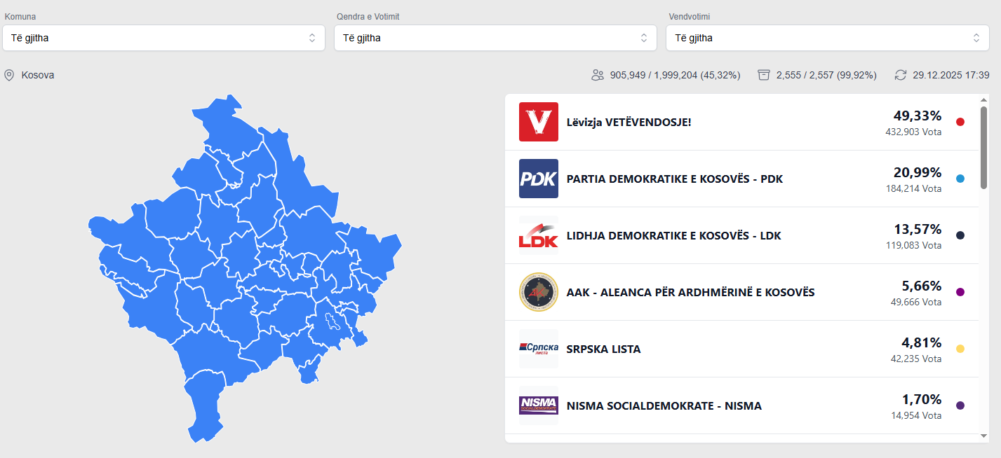 Deri tani janë numëruar 2555 nga 2557 kuti votimi, dhe Lëvizja Vetëvendosje (VV) kryeson me 49.33% të votave, sipas rezultateve të fundit të dala nga Komisioni Qendror i Zgjedhjeve (KQZ).