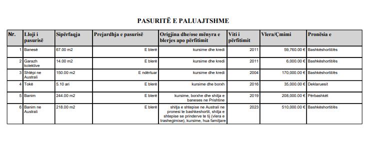 Po ashtu u deklarua edhe një banim në Australi e blerë në vitin 2023 në vlerë 510 mijë euro ( e blerë nga shitja e shtëpisë në Australi), nga kursimet familjare e të tjera).