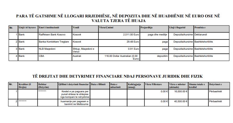 Po ashtu aty u deklaruan edhe paga e bashkëshortit sit ë hyra vjetore me 11 mijë e 68 euro dhe nga qiratë në Australi me 12 mijë e 500 euro. Pagesa nga vendimet gjyqësore në kuadër të MPJD-së, 19 mijë e 233 euro dhe mëditjet nga MPJD saktësisht 2 mijë e 795 euro.